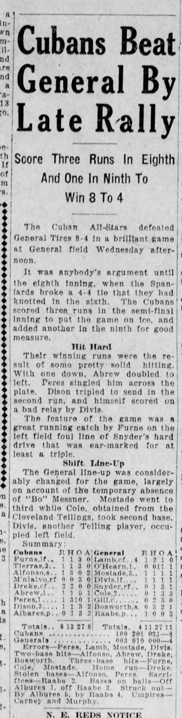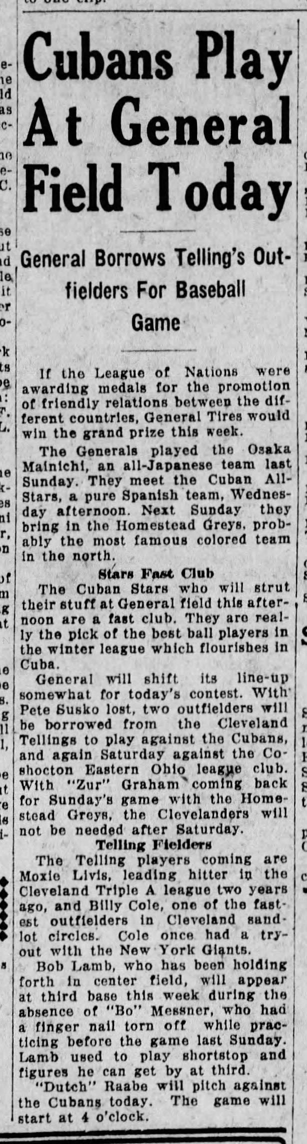 One intriguing possibility did arise in my research. On June 3, four days before Moxie’s first appearance in their lineup, the Cuban Stars played the General Tires team of Akron. The General Tires featured a ringer from the semipro Tellings Cream Tops of Cleveland: an outfielder named Edgar “Moxie” Divis.