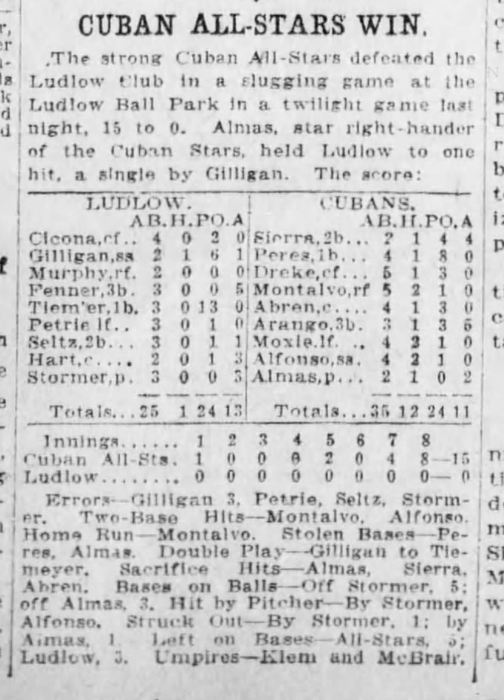 Although they were members of the Negro National League, the Cubans were in Cincinnati for a six-game series against clubs from the semipro KIO (Kentucky-Indiana-Ohio) League. “Moxie” would appear at least twice more in the series, in left field for a 15-0 demolition of the Ludlow Club on June 11 (Moxie hit 2 for 4) and as a left fielder and relief pitcher in an 8-5 win over the Cheviots on June 12.